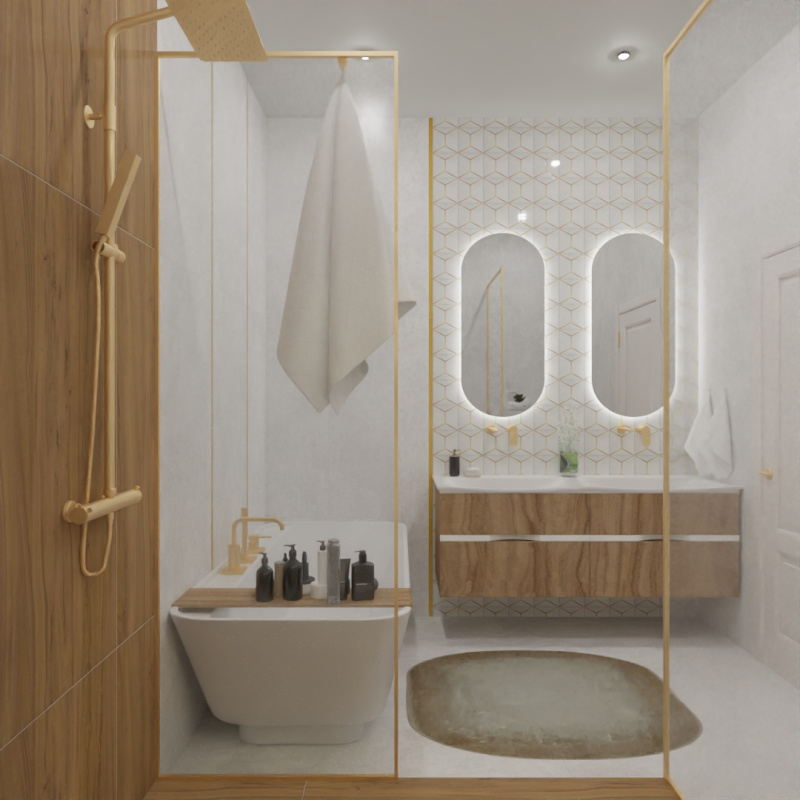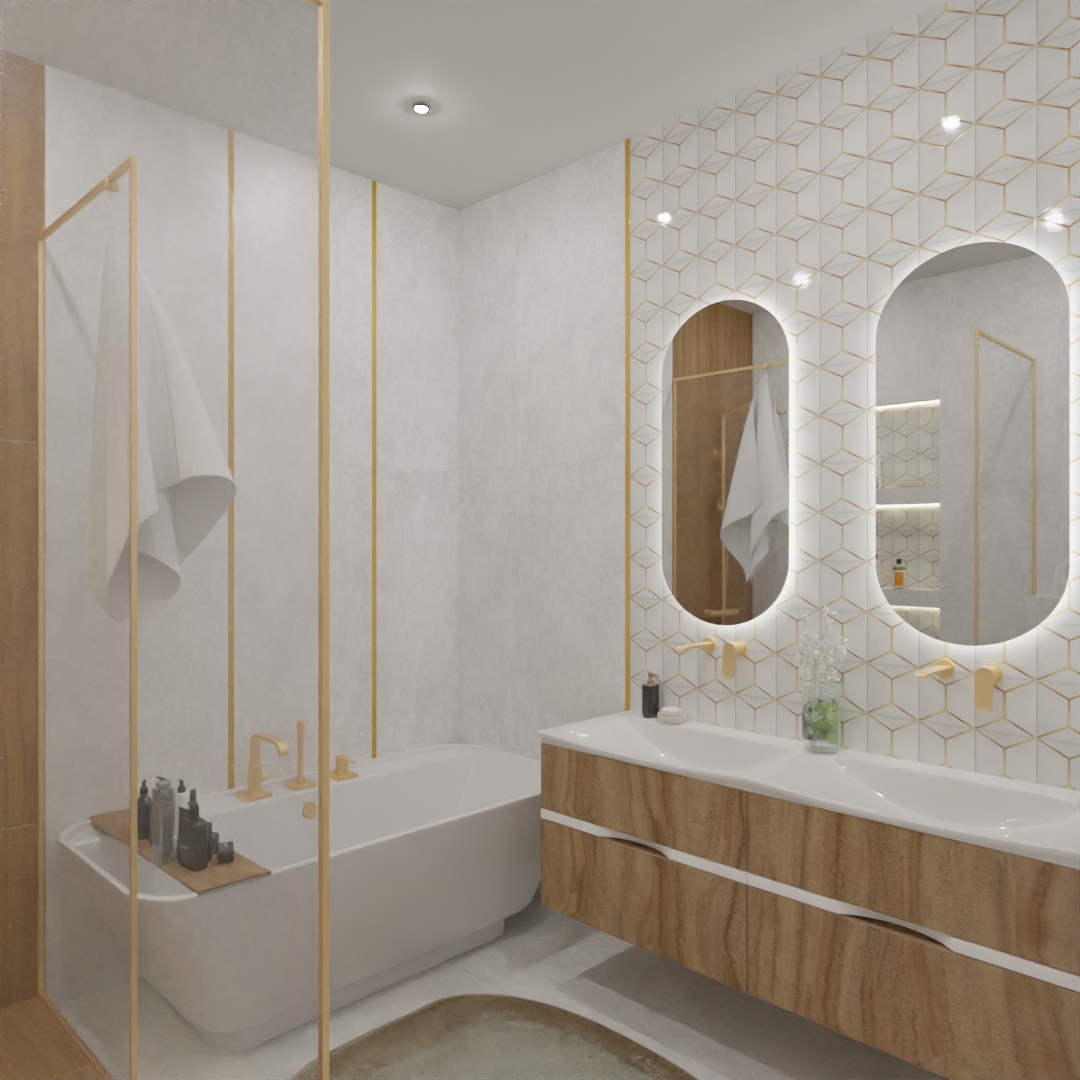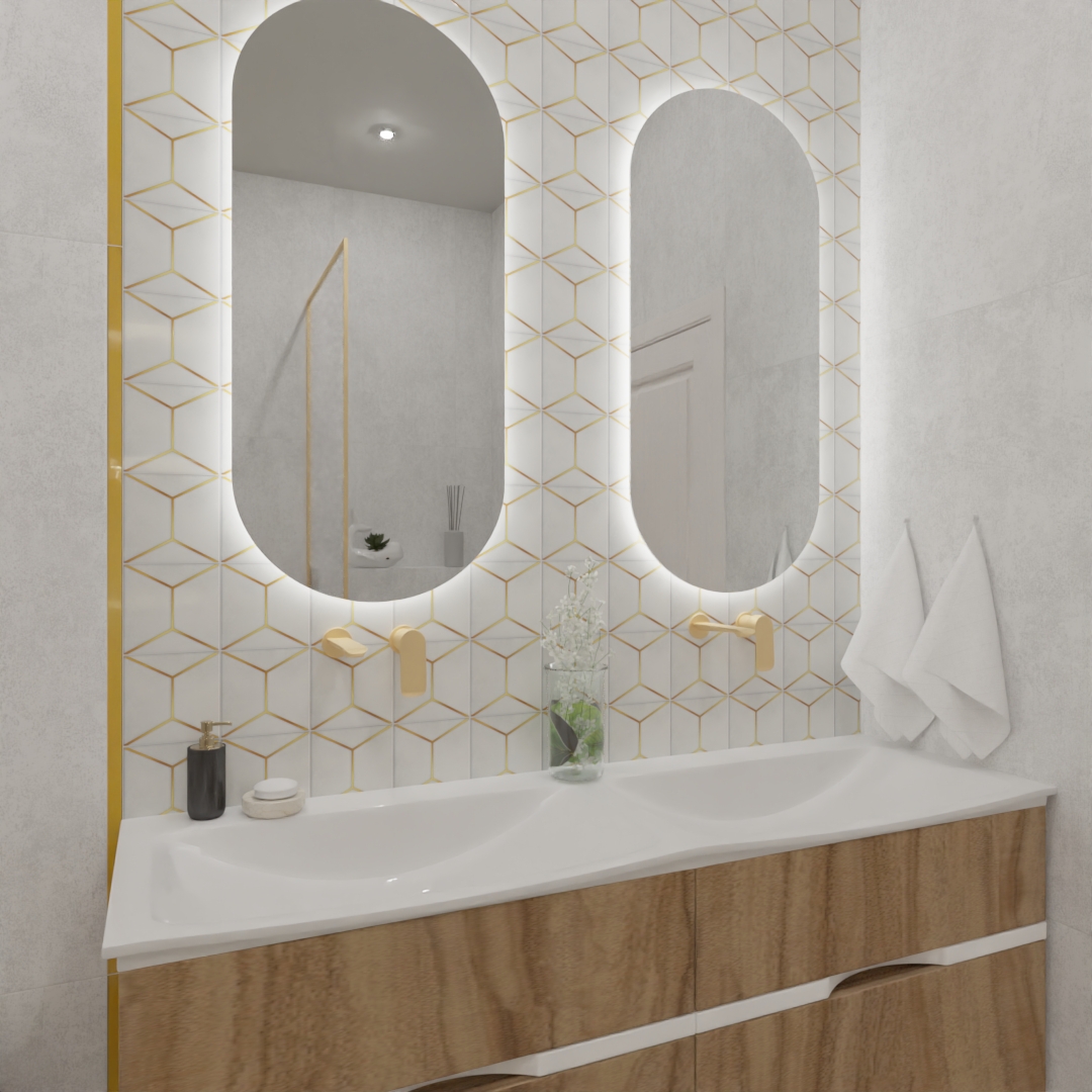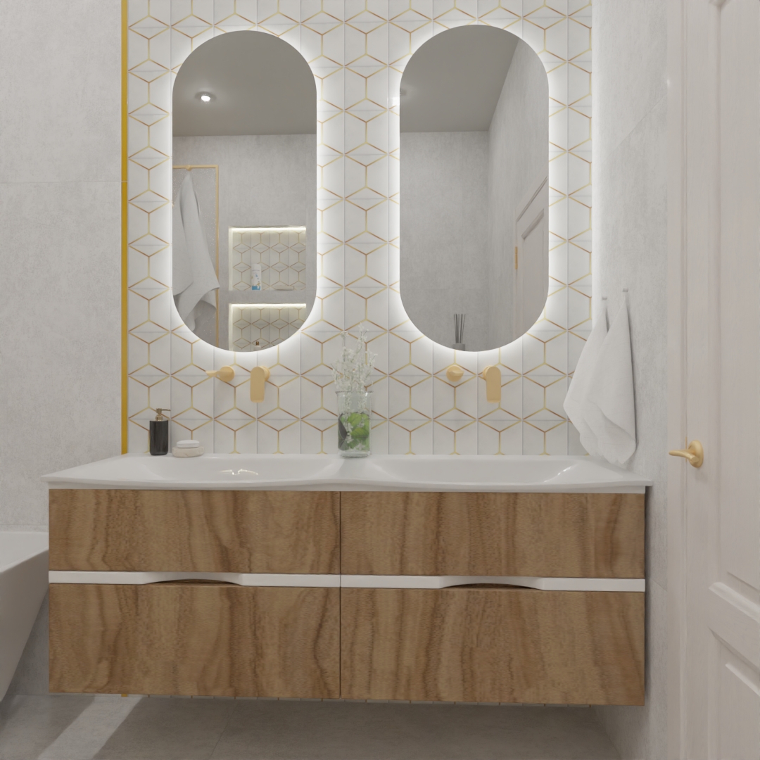 Если вы хотите добавить индивидуальности в дизайн квартир, берите на заметку этот прием. Главная изюминка нашего проекта — зона зеркал, оформленная декором Kerama Marazzi из коллекции «Витраж». Тонкий геометрический узор с благородными латунными акцентами мгновенно приковывает взгляд, превращая обычную стену в настоящее произведение искусства. Атмосферы добавляет мягкая LED-подсветка овальных зеркал, создающая уютное сияние.