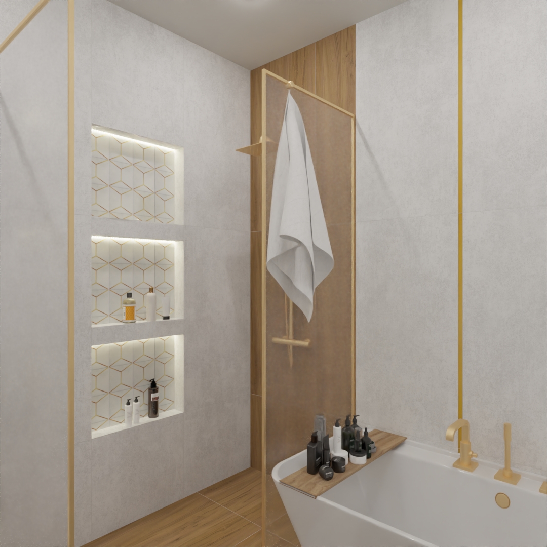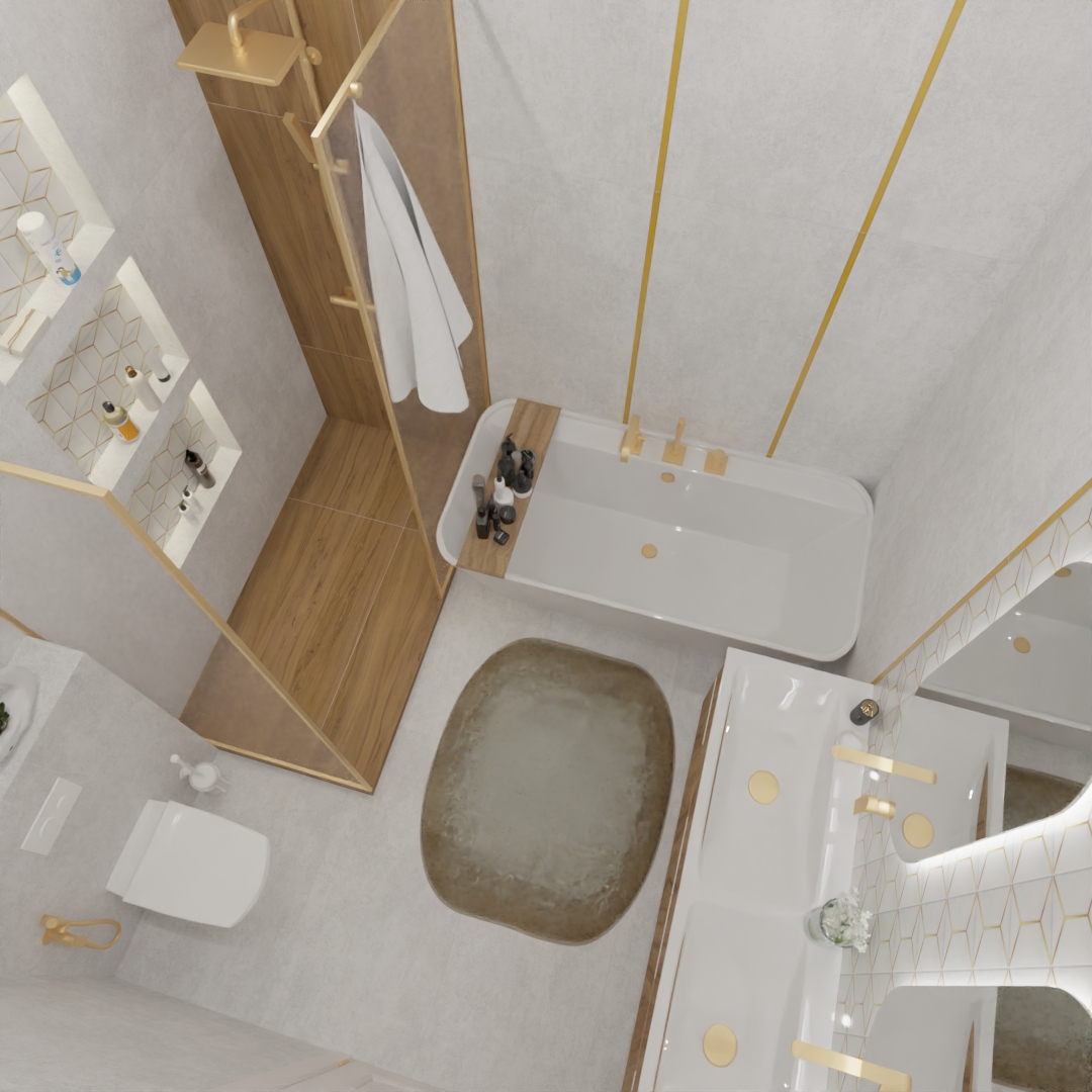 Итоговый ремонт ванной комнаты выглядит как картинка из дорогого журнала. Контраст холодного бетона и теплого дерева объединяется золотом фурнитуры, создавая целостный образ современного люкса. Здесь каждая деталь работает на общее впечатление, доказывая, что в продуманном дизайне квартир нет мелочей.